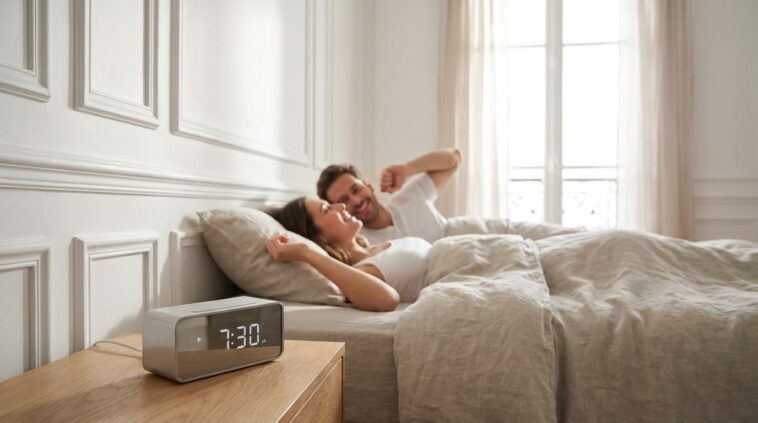Évidemment, rare sont ceux qui s’assoupissent à la seconde où leur tête touche l’oreiller, encore moins quand on vit à deux avec les habituels bavardages nocturnes. Il faut toujours inclure le temps d’endormissement moyen estimé à quinze minutes. Si vous visez ce coucher de 23h30, glissez-vous sous la couette ensemble vers 23h15. C’est le moment idéal pour se détendre, faire le point sur la journée et envoyer le signal corporel que la phase de récupération commence réellement, sans pression de devoir dormir à la minute près.